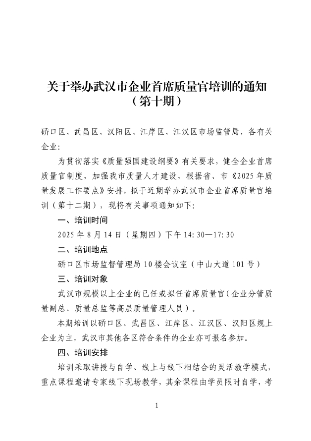 關(guān)于舉辦武漢市企業(yè)首席質(zhì)量官培訓(xùn)的通知(第十期)