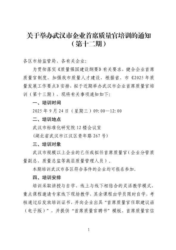 關(guān)于舉辦武漢市企業(yè)首席質(zhì)量官培訓(xùn)的通知(第十二期)